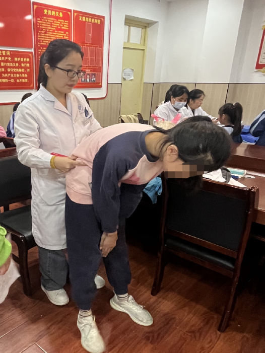 在篩查中,灤鎮中心小學的范同學引起了團隊的重視??祻蛶煱l現,她的肩膀和背部有著輕微的高低不平。當她彎腰做前屈試驗時,背部一側微微隆起——這是一個需要關注的信號。隨后的詳細檢查證實了初步判斷:她的脊柱呈現一個輕微的“S”形彎曲(胸左腰右),胸段側彎14度,并伴有骨盆和軀干的旋轉。這些看似微小的不對稱,若放任不管,可能隨著成長被放大。