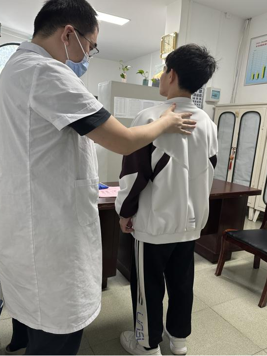 康復醫學科團隊遵循“精準評估、科學分級”的專業原則,為同學們開展系統化檢查。通過視診、觸診、Adam前屈試驗等多種科學手段,快速排查脊柱側方彎曲跡象,結合角度尺測量,精準判斷棘突中線偏離情況,同時記錄雙肩等高、骨盆對稱度等關鍵體態數據,為每位學生建立初步健康檔案。