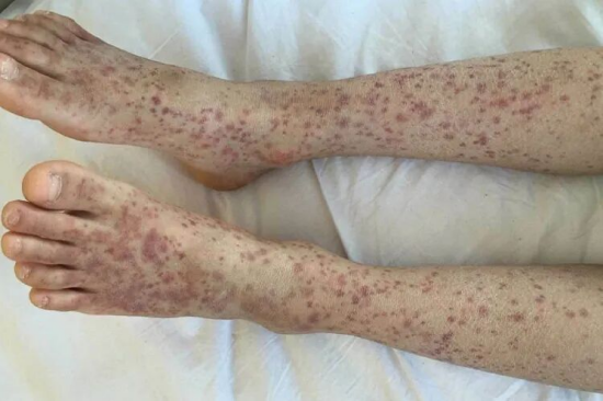 最常見的類型,表現為四肢、軀干的紅色瘀點、瘀斑,按壓不褪色。很多人會誤以為是“磕碰傷”或“過敏疹”,容易忽視。