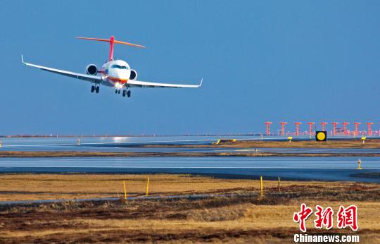 中國自主研制的ARJ21-700飛機的104架試飛飛機在遠赴冰島完成大側(cè)風(fēng)試飛后,平穩(wěn)降落在西安閻良機場。 中國商飛供圖