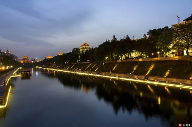 護城河邊,燈景與水景融為一體,溫婉浪漫。