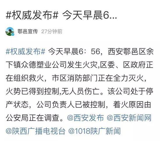 9點(diǎn)19分,鄠邑宣傳在官方微博發(fā)布消息稱,今天早晨6點(diǎn)56分,西安鄠邑區(qū)余下鎮(zhèn)眾德塑業(yè)公司發(fā)生火災(zāi),區(qū)委、區(qū)政府正在組織救火,市區(qū)消防部門(mén)正在全力滅火,火勢(shì)已得到控制,無(wú)人員傷亡。該公司處于停產(chǎn)狀態(tài),公司負(fù)責(zé)人已被控制,著火原因由公安局正在調(diào)查。