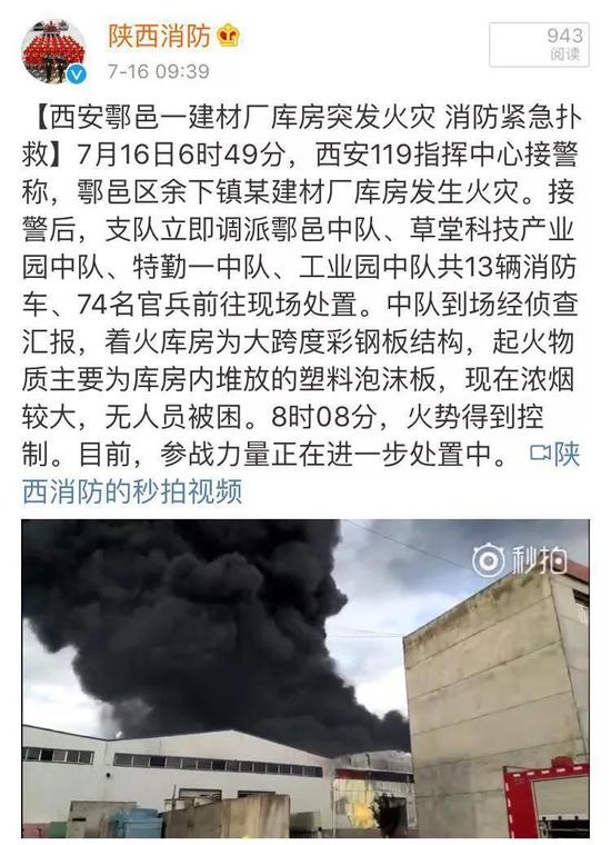 上午9:39陜西消防微博發(fā)布火情消息稱,7月16日6時(shí)49分,西安119指揮中心接警稱,鄠邑區(qū)余下鎮(zhèn)某建材廠庫(kù)房發(fā)生火災(zāi)。
