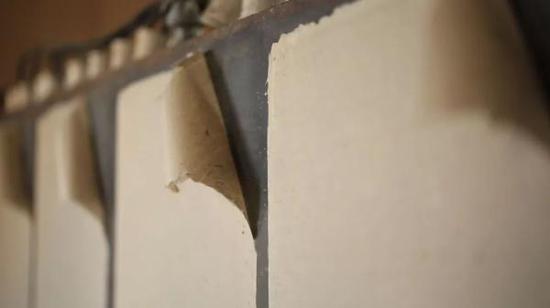將撈出的紙疊放在一起進行壓制,之后一張張揭開,貼在室內的火墻上烘干。至此,成品紙才算完成。