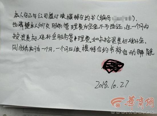 模特公司:手機是私人物品,經過同意才幫助操作10月30號,華商論壇網友神龍衛視發帖稱:10月27號去應聘的模特, 10月28號協商退錢,被要求按模特公司的規定補齊2800元,才可以退出。并質疑,如果是正規公司,正式合法有效的合同,為什么解約書和承諾書讓模特手抄寫,而且是只給他們公司留一份,沒有給合約模特一份呢?公司負責人解釋稱,就是公司規定。網友認為這是模特公司給無知的孩子們挖的陷阱。并向蓮湖區工商局、西關工商所、西大街派出所等部門反映。