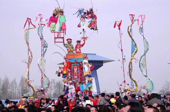 熱鬧非凡的漢中社火以“洋縣懸臺社火”和“協(xié)稅社火”最為有名。一般在春節(jié)時街鎮(zhèn)村巡回表演,形式多樣。有懸臺芯子、高蹺、地社火等,以各種臉譜服裝扮演戲劇人物、場面,溶音樂、舞蹈、美術(shù)、雜技于一體。“洋縣懸臺社火”又稱洋縣高芯子社火。此種社火是以戲劇角色站在高臺梁架上為表演形式,昔日以人抬肩扛為主要運(yùn)載方式(現(xiàn)多改用車輛承載)的一種特殊的社火,它匯集了民間各種社火的精華,為陜西南部的洋縣城鄉(xiāng)所特有,已有300年的歷史。