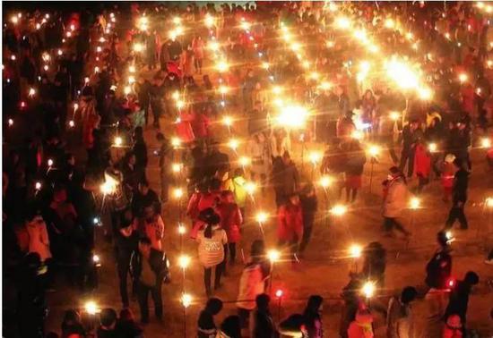 陜北黃土高原的民俗活動“轉(zhuǎn)九曲”一般在除夕前后舉行,當(dāng)?shù)卮迕裨诖迓溥叺目盏厣希圆薀舻男问綌[下九曲黃河陣,當(dāng)?shù)卮迕駛儼凑找?guī)則穿梭在一片彩燈的海洋里歡聲笑語,臉上洋溢著對美好生活的無限向往。