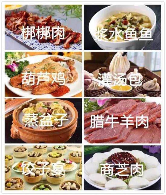 [宴客菜]:梆梆肉、灌湯包、葫蘆雞、漿水魚魚、餃子宴、臘牛羊肉、商芝肉、蒸盆子