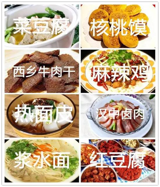 [宴客菜]:菜豆腐、漿水面、紅豆腐、熱面皮、麻辣雞、漢中鹵肉、西鄉(xiāng)牛肉干