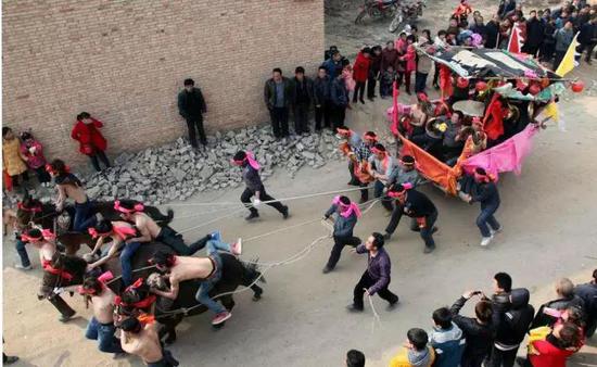 四匹騾子頭掛披紅、系銅鈴、插著彩旗,連接著一輛皮輪騾車,騾車上6位敲鼓人鼓點(diǎn)整齊,駕轅人鞭子“吧嗒”一甩,騾子放開腳步恣意狂奔,嘶鳴聲、鑼鼓聲、銅鈴聲以及圍觀者的歡呼聲、喝彩聲響成一片,這就是著名的渭南跑騾車。跑騾車是渭南人祖輩“祈年成”和慶豐收的習(xí)俗,逢年過節(jié)或是有婚喪嫁娶、滿月、祝壽等喜慶活動時,騾車隊(duì)就會組織起來熱鬧一番。