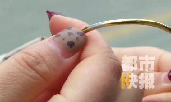 記者看到,這只“掉色”的黃金手鐲的確有幾處發白的地方,最大的一處和手指一樣寬,確實感覺像褪了色一樣。難道這鐲子真的有問題?