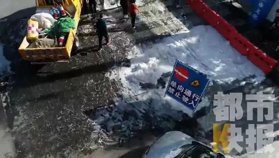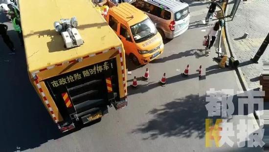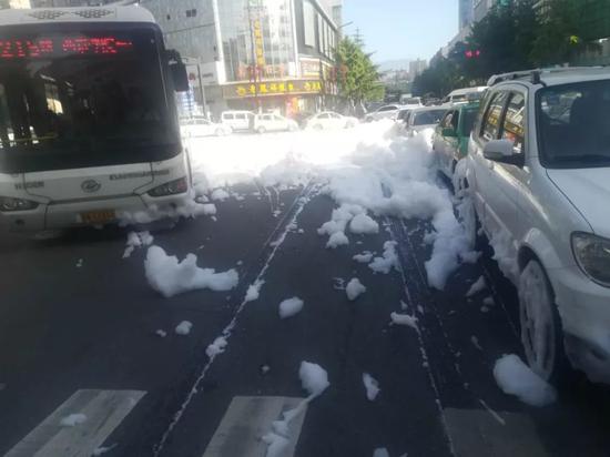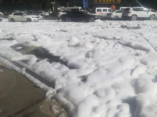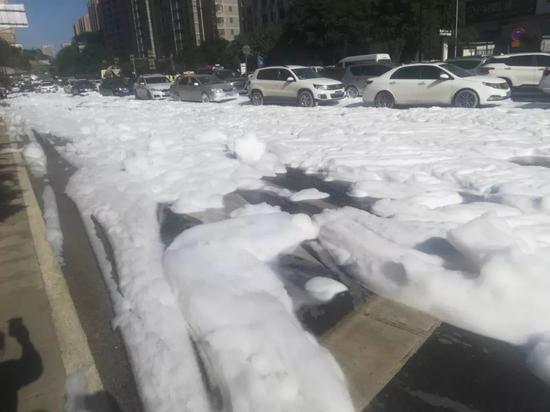 隨后,記者迅速趕往了事發現場,看到這些白色泡沫是從街道一個井蓋的縫隙間涌出的。據附近市民介紹,白色泡沫迅速鋪滿整條街道,一度影響到了交通。