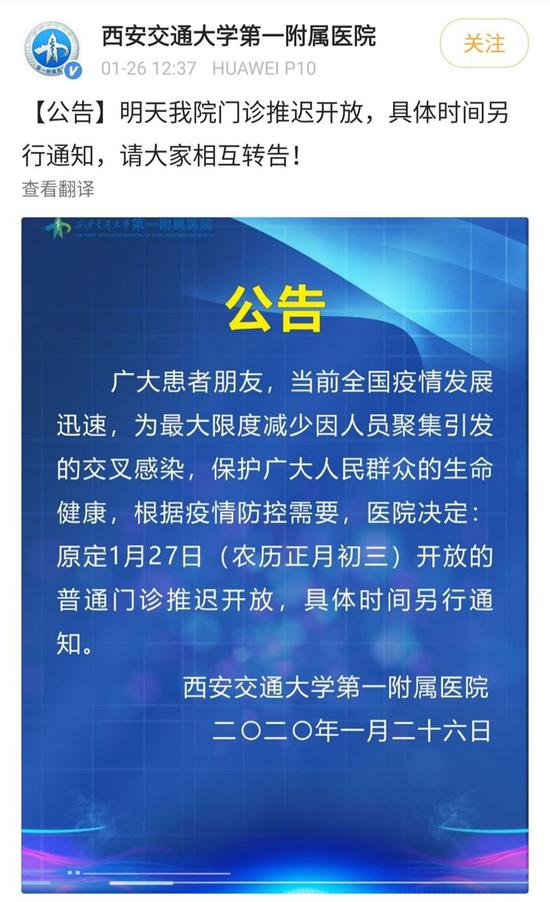 西部網訊 西安交大一附院今天(1月26日)發布門診推遲開放公告稱,明日門診推遲開放,具體時間另行通知。