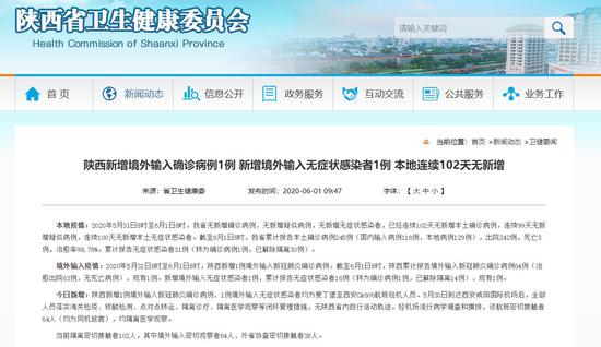 境外輸入疫情:2020年5月31日8時至6月1日8時,陜西新增1例境外輸入新冠肺炎確診病例。截至6月1日8時,陜西累計報告境外輸入新冠肺炎確診病例64例(治愈出院63例,無死亡病例),現(xiàn)有1例。新增境外輸入無癥狀感染者1例,累計報告無癥狀感染者16例(轉為確診病例1例,已解除隔離14例),現(xiàn)有1例。