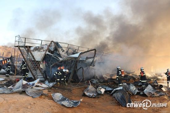 榆林消防支隊特勤一中隊消防員李鑫告訴記者:“還沒到現(xiàn)場就看見煙比較大,彩鋼房數(shù)量比較多,是二層搭建的,火勢比較大,人員根本靠近不了,基本57間都燒著了,是施工工人住的(宿舍),里面有煤氣罐,還有些是庫房之類的。”