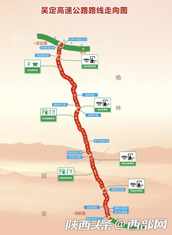 吳定高速今日通車。記者了解到,吳起至定邊高速公路是陜西省“2367”高速公路網規劃的第三縱——定(邊)漢(中)線的重要組成部分,全長92.2公里。路線起于延安市吳起縣走馬臺,以互通立交與延志吳高速公路相接,止于榆林市定邊縣石井子,以樞紐立交與國家高速青(島)銀(川)線靖邊至王圈梁高速公路相接。吳定高速以雙向四車道高速公路標準,設計時速100公里每小時,路基寬度24.5米。全線設橋梁28403.46米,共121座,隧道5685米,共4座,其中控制性梁臺隧道2102米、楊井隧道2391米。全線設吳起、吳起北、新安邊、楊井、定邊南等互通立交(收費站)5處,石井子樞紐立交1處,吳起北、定邊南服務區2處,定邊停車區1處。