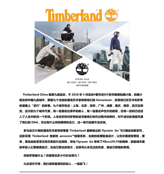 為你的城市打Call 為你的堅(jiān)持應(yīng)援 Timberland Flyroam Go 九城連動(dòng) 夢想同步起飛